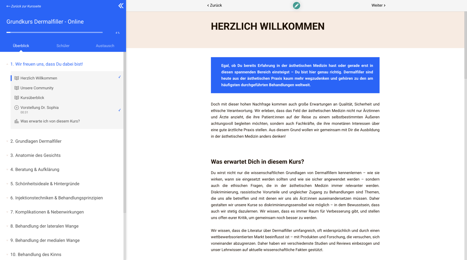 Es ist allerdings wichtig, dass Du auch die rechtlichen Vorgaben und berufsrechtlichen Rahmenbedingungen in Deinem Land bzw. in Deiner Region beachtest. Diese können sich auf die erforderlichen Qualifikationen und die Zulassung zur Ausübung der ästhetischen Medizin beziehen. Stelle also sicher, dass Du alle notwendigen Bedingungen erfüllst, bevor Du mit der Behandlung von Patientinnen beginnst. Wir wollen, dass Du sicher und hochwertig Deine Patient:innen behandeln kannst. Darum begleiten wir Dich auch mit unserer Community nach Deiner Ausbildung bei uns in Deiner praktischen Tätigkeit.