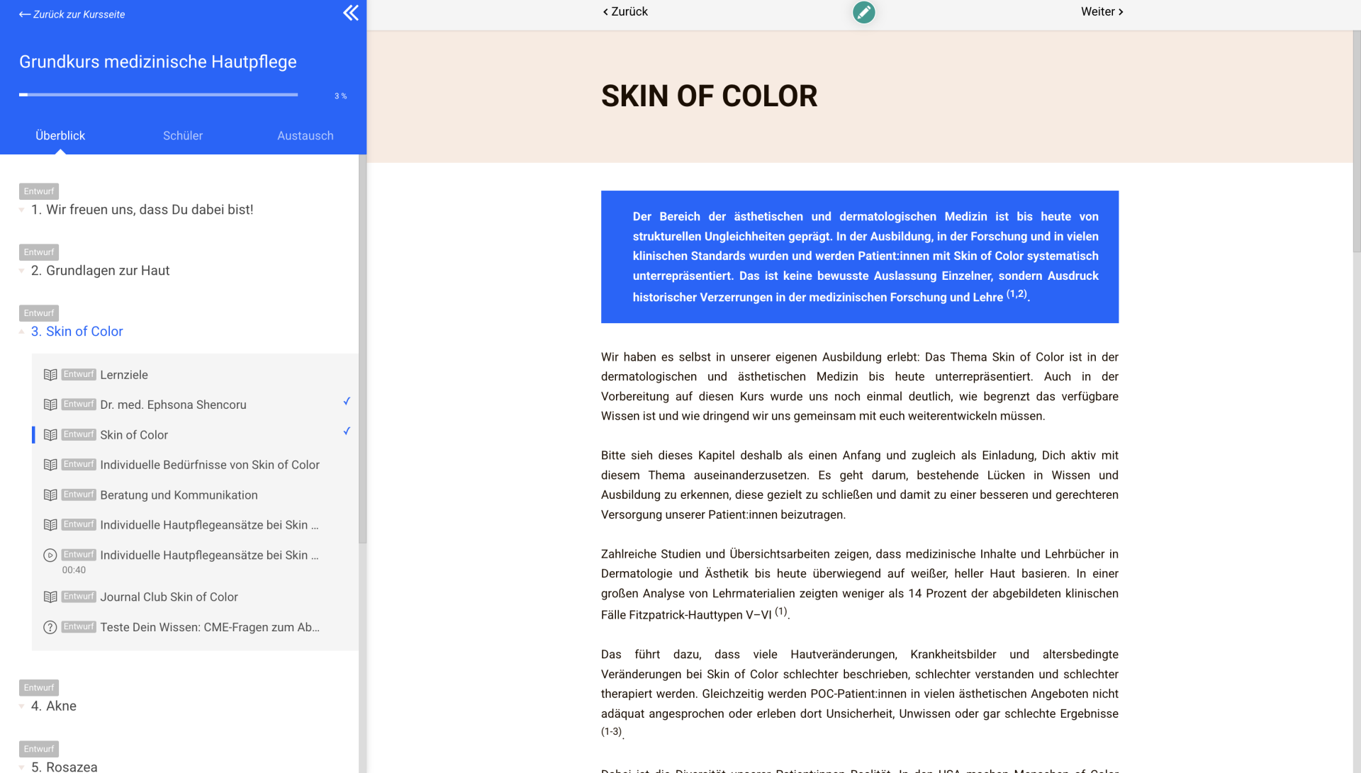 In diesem Grundkurs lernst Du, medizinische Hautpflege fundiert und patient:innenzentriert anzuwenden. Wir erklären die häufigsten dermatologischen Krankheitsbilder mit ästhetischer Relevanz und gehen auf Besonderheiten von Patient:innen mit Skin of Color ein.